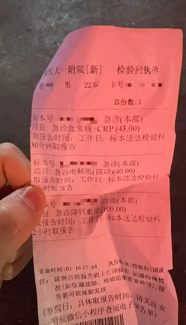 下午 4 点多,发现可能今天轮不到了,体温又有点烧回来了,就急忙去挂了一下急诊,结果发现急诊前面也有相当多人,不过相对于门诊来说好点,遂额外等待了 1 个小时左右吧,终于轮到我了,然后让我去采血了,