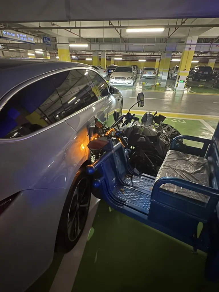 - 下去一看,原来是三轮下地库刹不住了,连创了几辆,最后一头停扎在我车上(师傅,这个车位不让停那么多车)